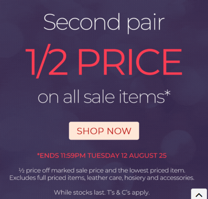 1/2 price off marked sale price and the lowest priced item. Excludes full price items, leathercare, hosiery and accessories. While stocks last.