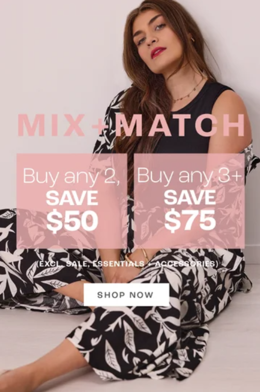 Buy 2, Save $50, Buy 3+ Save $75, available for a limited time only, in store + online. Discount applied at cart. Offer applies to full priced styles only. Excludes Essentials, Sale items and Accessories. Not to be used in conjunction with any other offer. This promotion is not valid at K+K Outlet stores. K+K Fashions reserves the right to end or modify this promotion at any time.