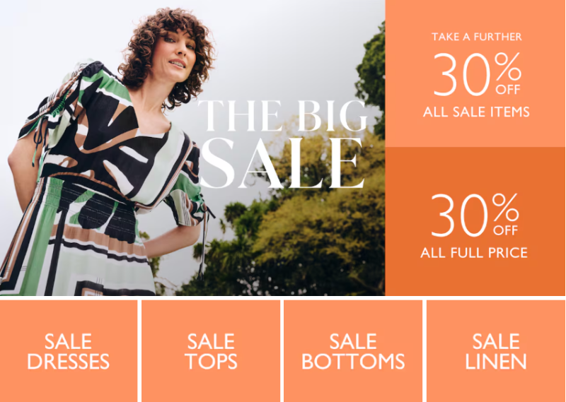 30% OFF full price. Take a further 30% OFF sale items. 40% OFF all tops and dresses.